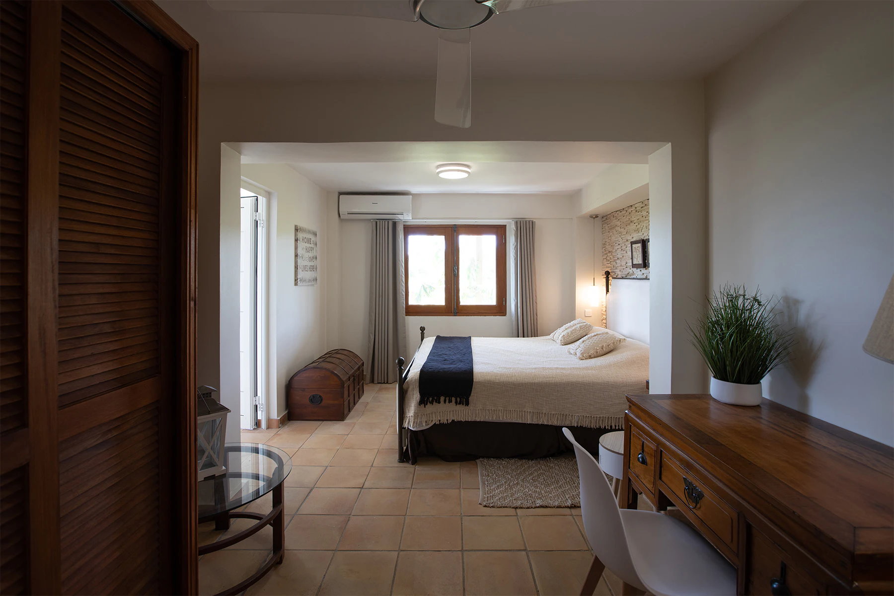 Inside, the villa’s bright and breezy great room brings together a gourmet kitchen, relaxed dining spaces, and a comfortable TV lounge—all wrapped in soft blue accents that echo the Caribbean Sea. Large glass doors open to both the pool terrace and a shaded outdoor living area, making it easy to embrace indoor–outdoor living at its finest. Alfresco dining is a highlight here, with a spacious outdoor table set beside the kitchen—ideal for savoring meals prepared by a private chef. Additional amenities such as an outdoor kitchen, fitness area, hammock, and multiple shaded seating nooks ensure that every guest finds their perfect space to unwind.