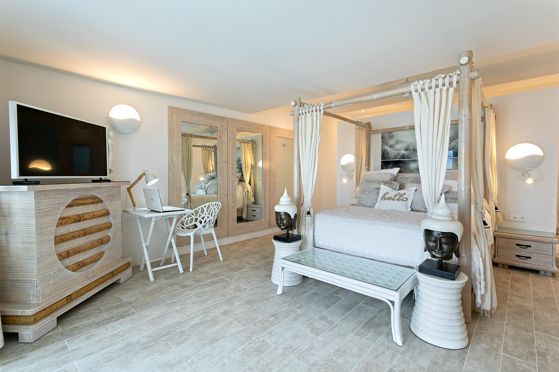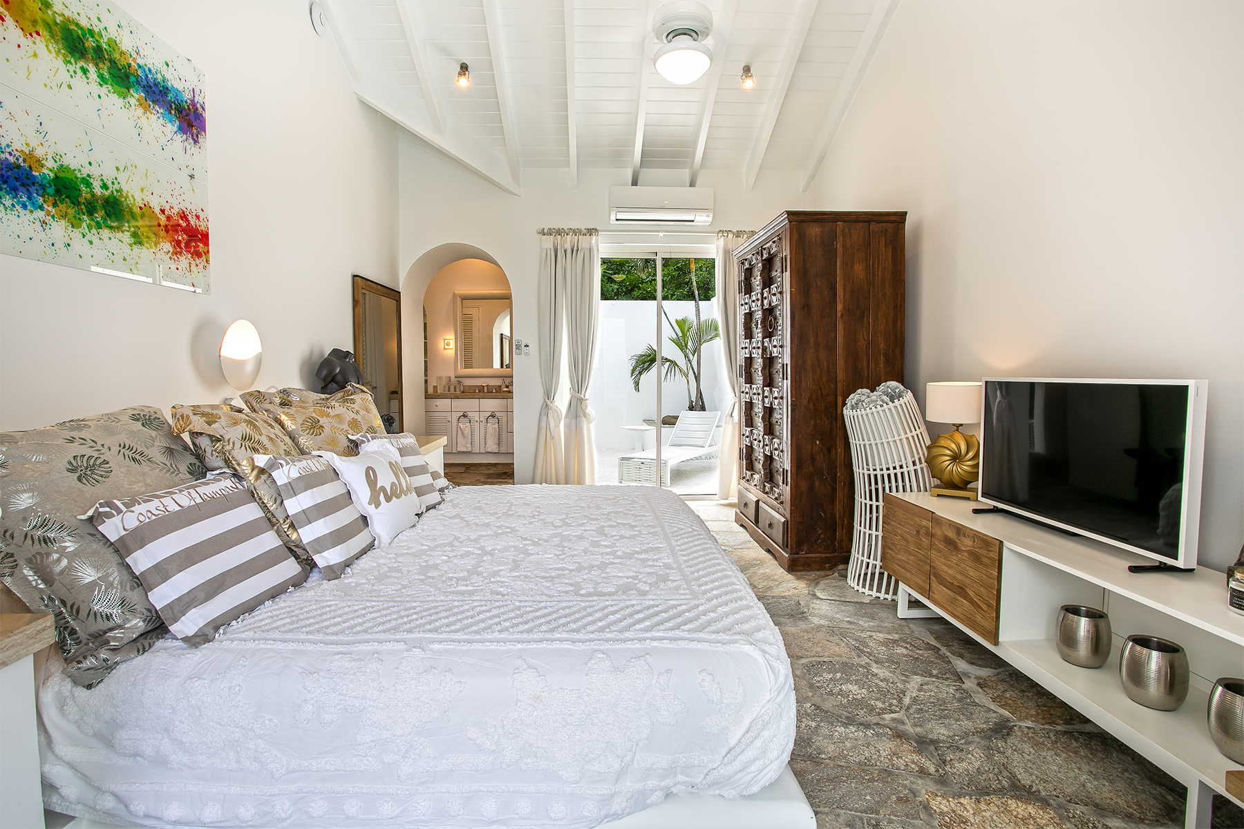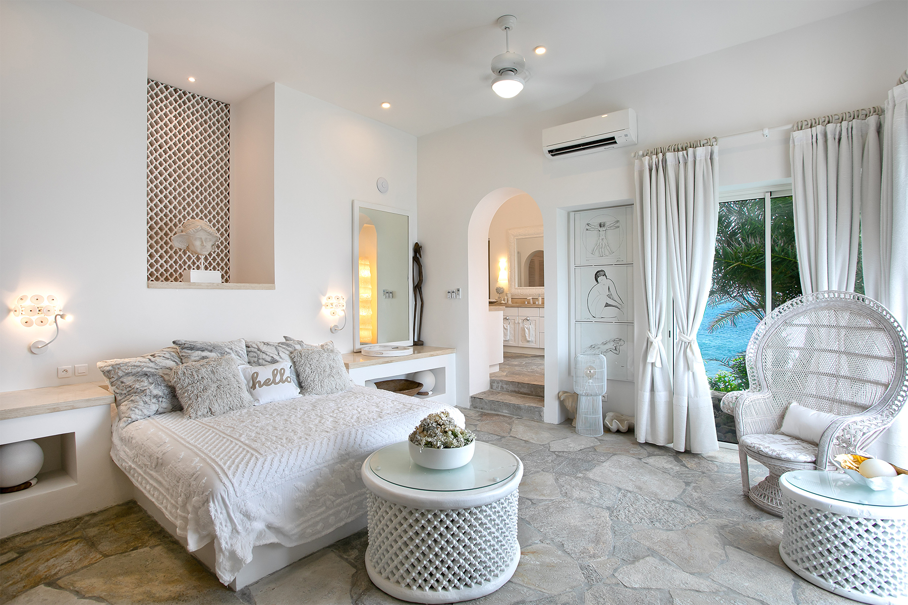 The villa welcomes guests through lush tropical gardens into a bright domed foyer, leading into a grand living room framed by floor-to-ceiling glass and luminous interiors. High ceilings and stone floors create a cool, refined atmosphere, with comfortable lounges, a 10-seat dining area, and a dedicated media room equipped with widescreen TV and surround sound. A fully air-conditioned option ensures comfort throughout. The adjoining gourmet kitchen, equipped with professional-grade appliances, white cabinetry, and quartz countertops, enjoys spectacular ocean views and direct access to both indoor and outdoor dining areas. Outside, the main terrace features an asymmetric pool and a dramatic diamond-shaped sun deck that extends toward the horizon like the prow of a ship—an unforgettable setting for sunbathing, lounging, and taking in the expansive ocean panorama.
