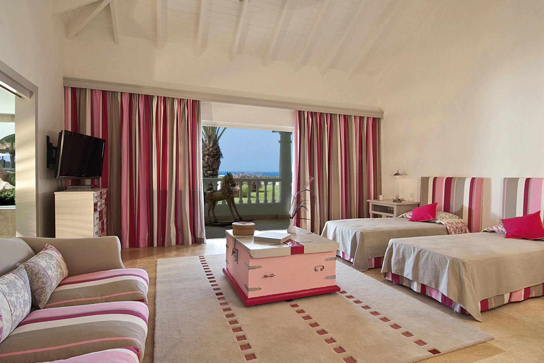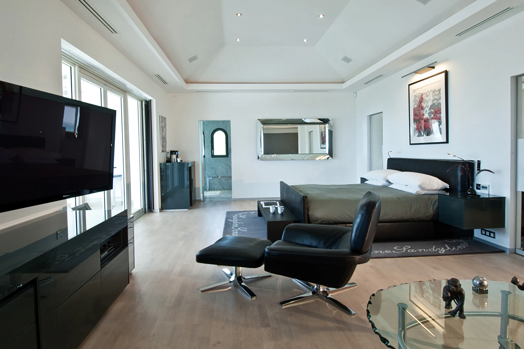 The estate accommodates up to 14 guests across 6+1 bedrooms, including four master suites with luxurious en-suite bathrooms. Expansive living areas flow into terraces with panoramic ocean views, while a gourmet kitchen and home cinema elevate the in-villa experience. Outdoor highlights include two heated pools, an infinity Jacuzzi, sun decks, a poolside bar and gazebo, and an air-conditioned covered terrace for shaded relaxation.