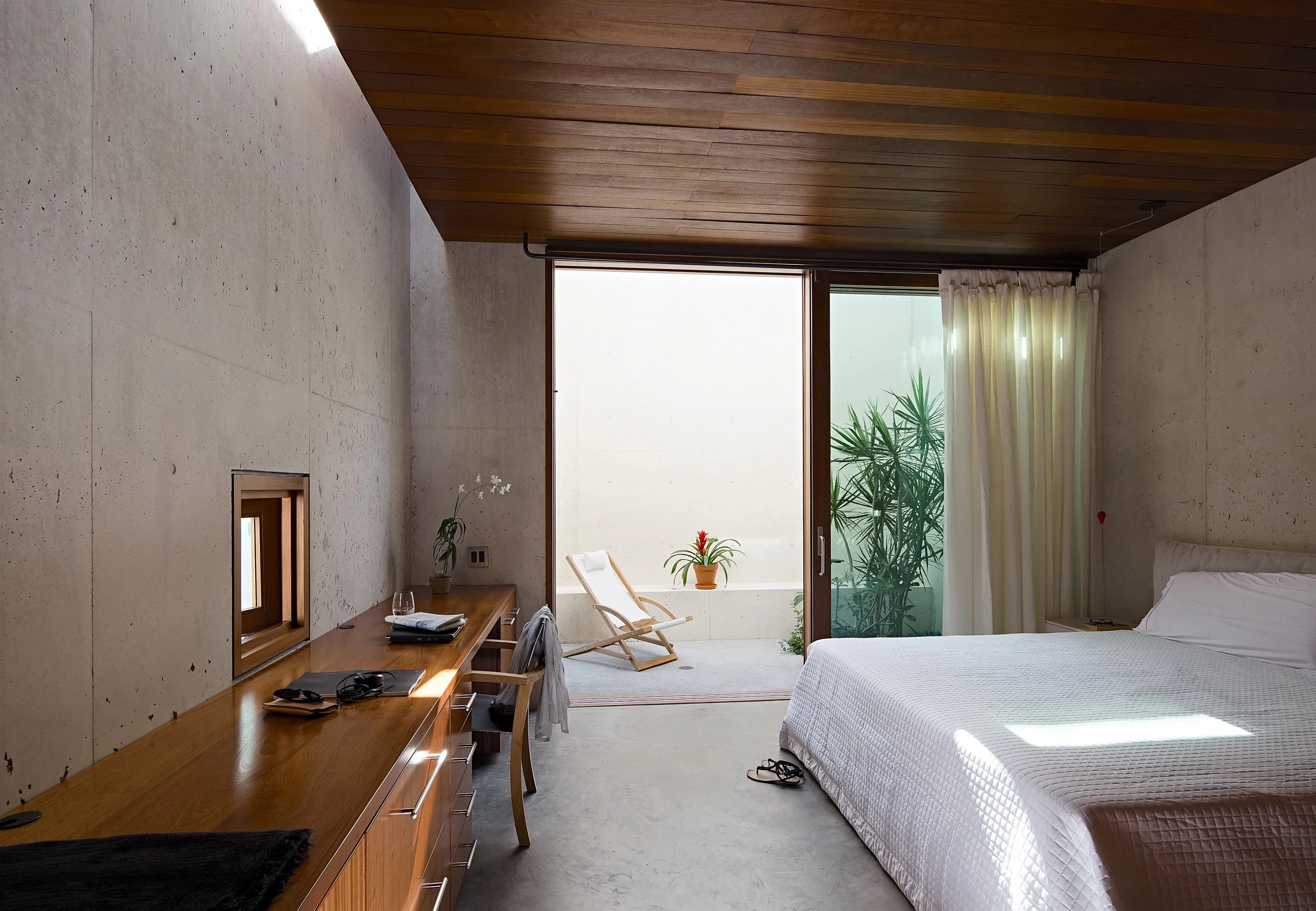 The villa's striking concrete architecture features thoughtfully positioned openings that invite abundant natural light and cooling sea breezes throughout the interior spaces. The innovative design creates a seamless flow between indoors and out, while maintaining complete privacy from the street side.