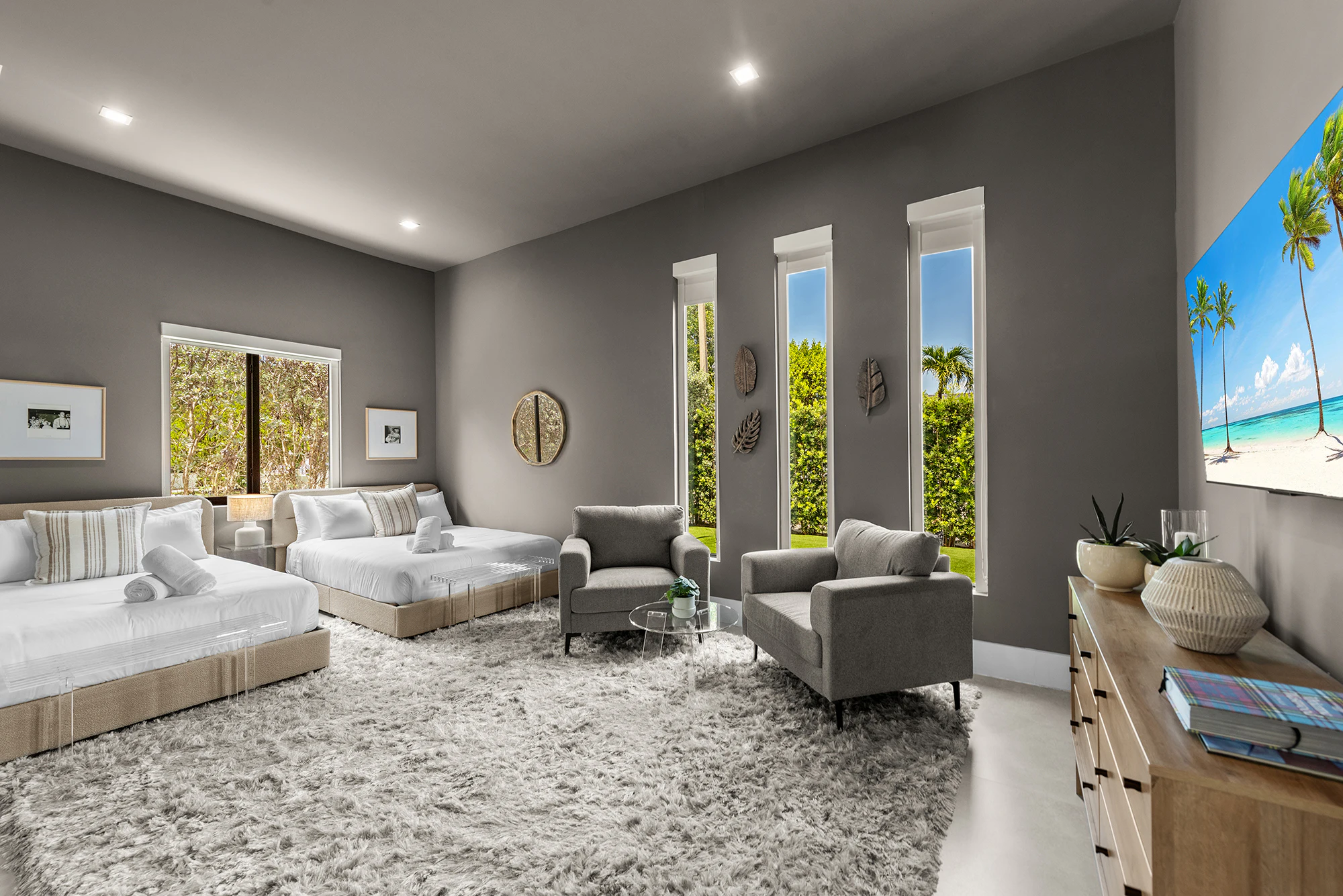 Inside, light-filled living areas flow seamlessly to the outdoors, while five plush bedrooms—including two with king beds—accommodate up to 14 guests in comfort. Just minutes from Miami’s best dining, shopping, and beaches, this private oasis blends style, comfort, and entertainment for the ultimate getaway.