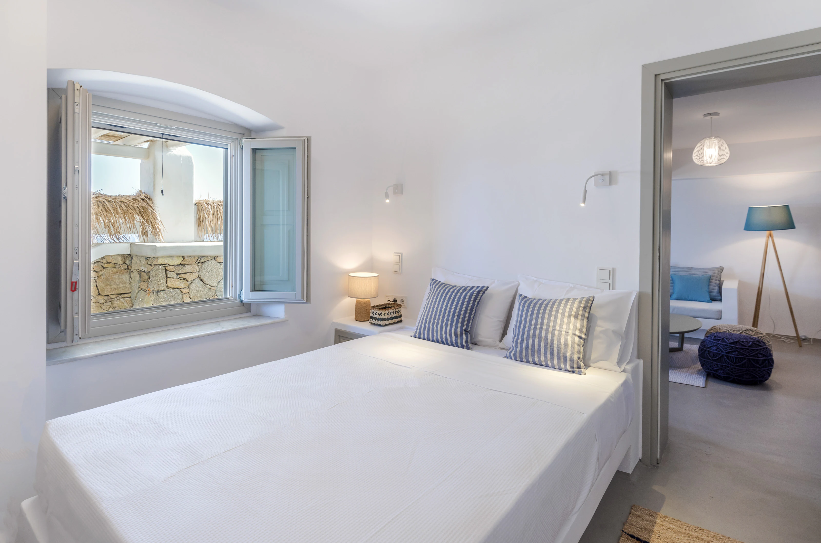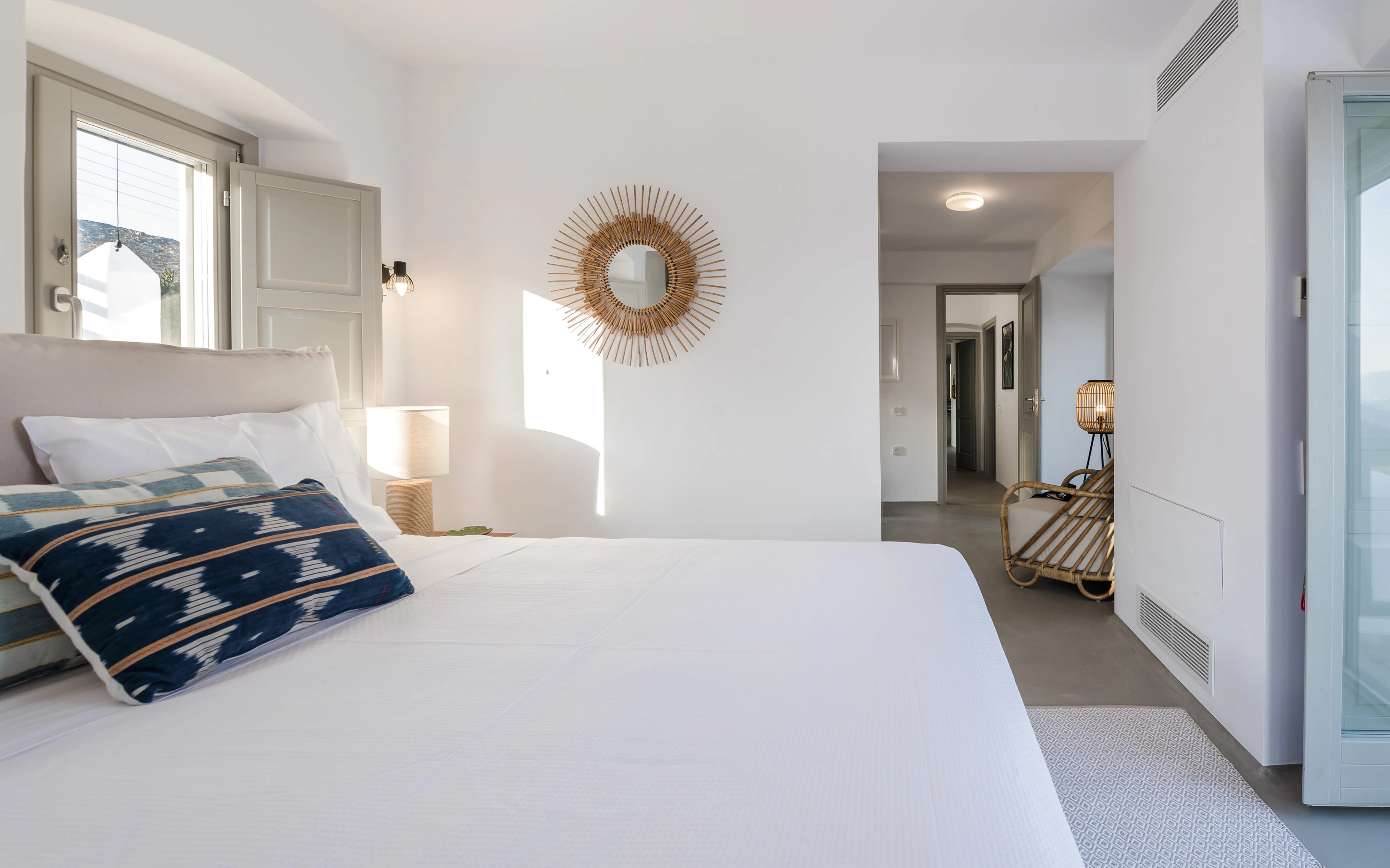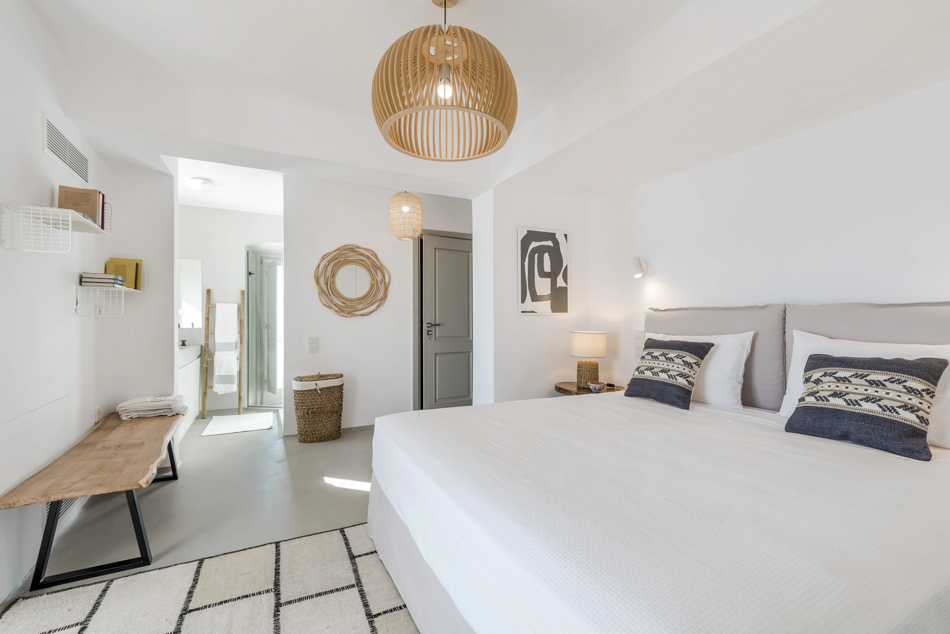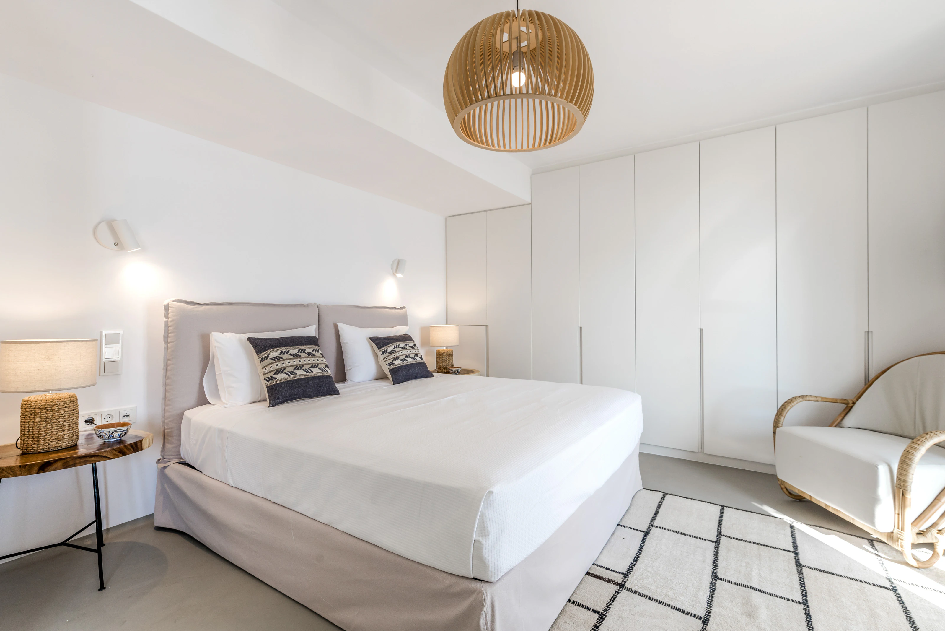 Reflecting the iconic Mykonian style, the villa's architecture is characterized by its whitewashed exterior and minimal Art Deco interiors. The ambiance inside is one of luxury and understated elegance. Furnished in a contemporary style, it combines classic wooden pieces with bohemian elements and modern amenities for enhanced comfort. The exterior spaces, featuring a private swimming pool and sunbeds, along with the tranquility of the nearby beach, offer guests a sense of absolute freedom and relaxation