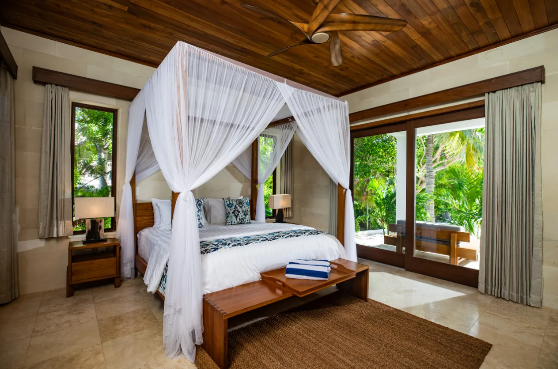 Each of the two bedrooms comes with fourposter beds, and an exotic outdoor bathroom with a rain shower, while the main bedroom also offers an open-air bath. There's a deck on the lower level as well, with more direct views of the beach. Meanwhile, the second floor provides an open-plan living room and kitchen, as well as dining areas and a private pool. A third floor even provides access to an observation deck with 360-degree views.