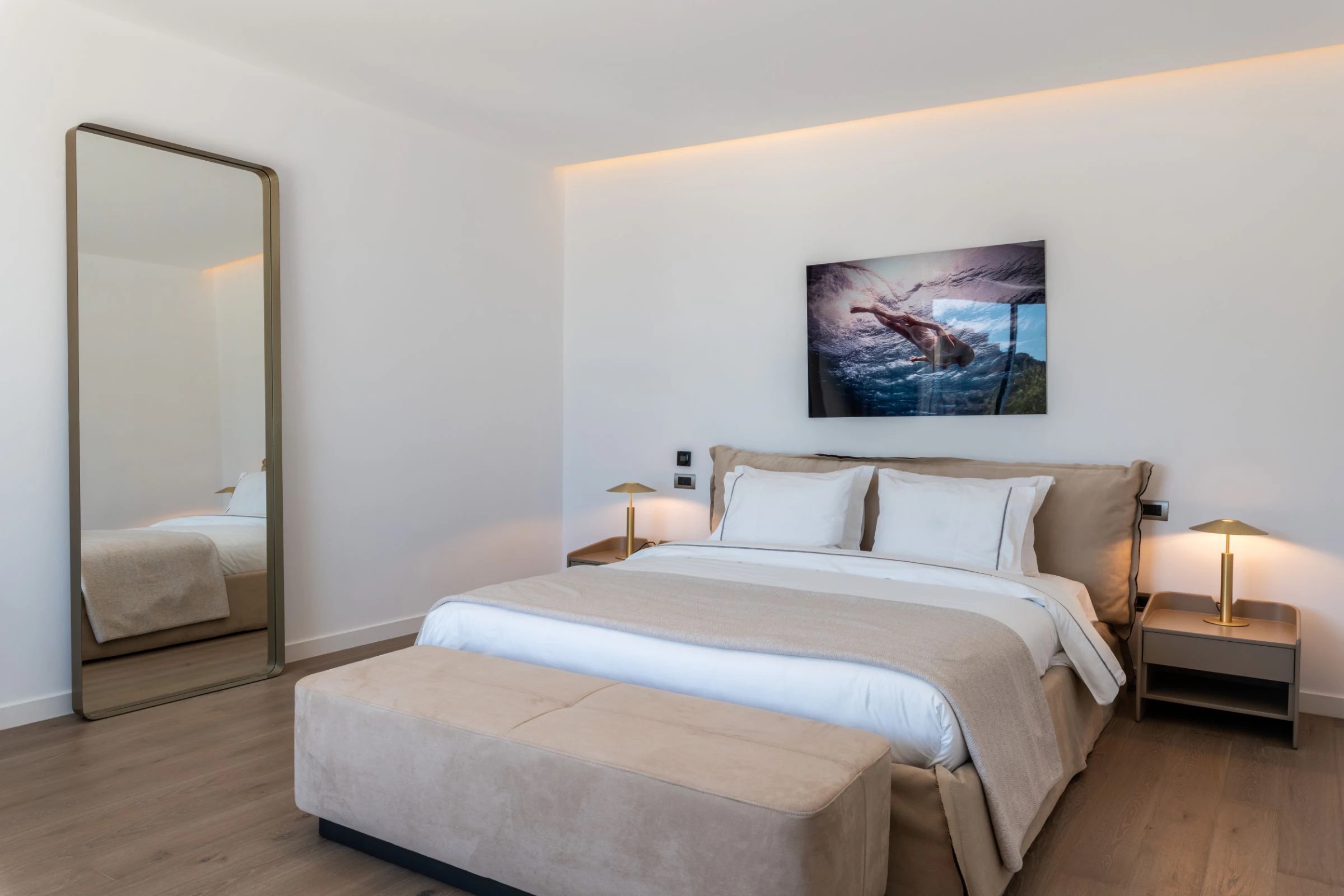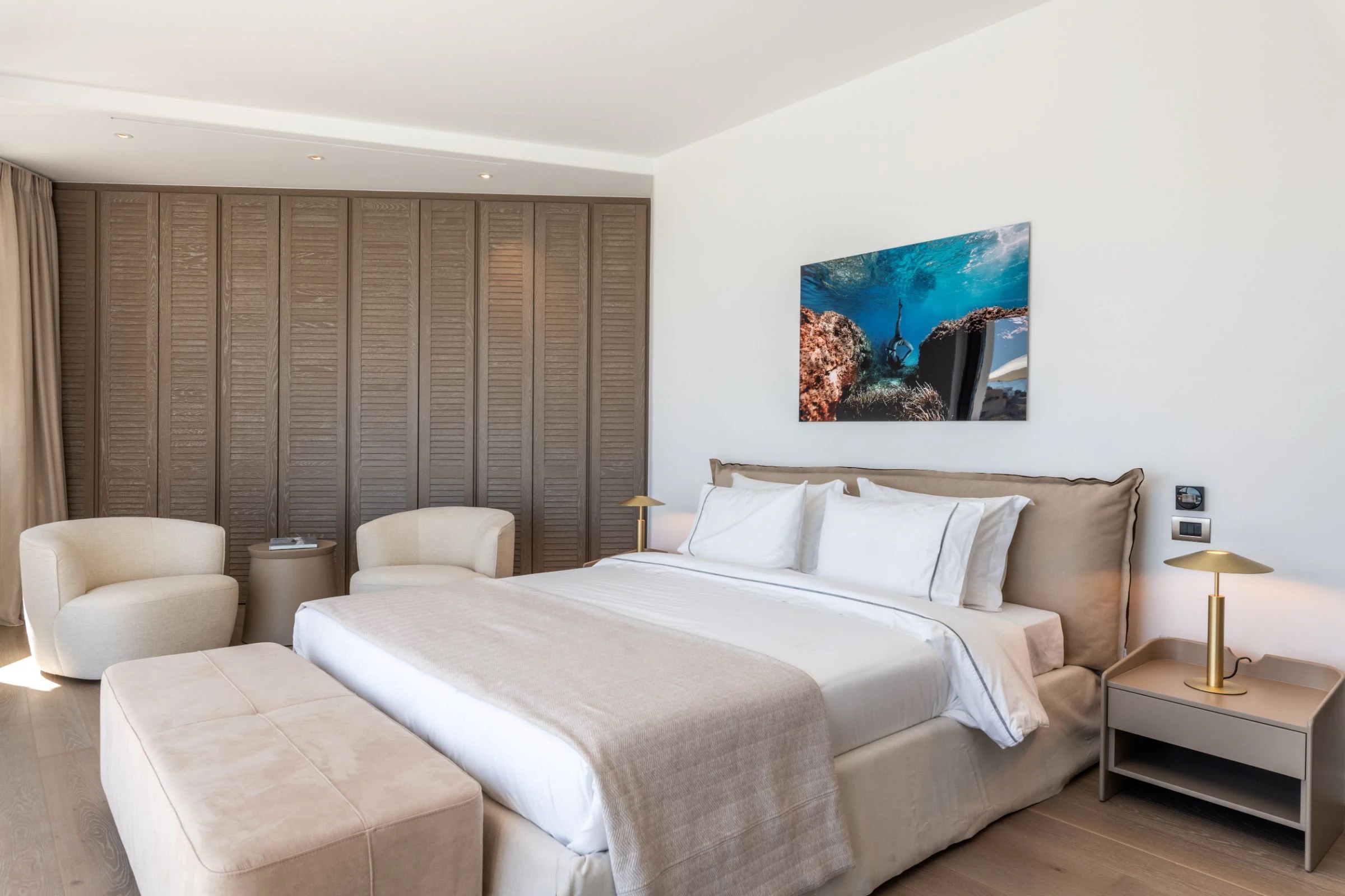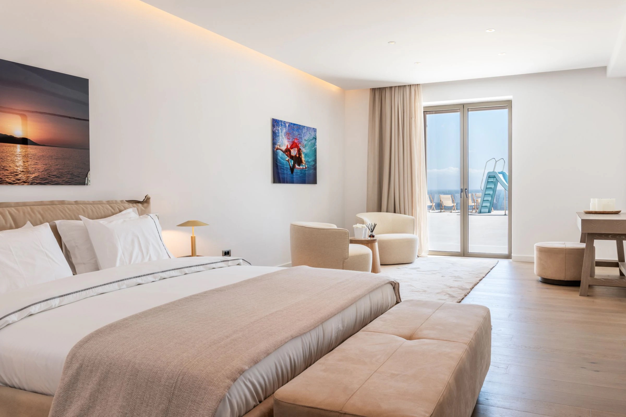 The huge outdoor spaces are impeccably designed to offer true moments of relaxation and all-day fun in the alfresco BBQ and kitchen, in the dreamlike lounging and dining areas, in the private luxurious pool bar, in the spacious Jacuzzi, as well as the two huge infinity pools (27m & 18m), located on different levels for total privacy. No need to mention that there is of course a kids’ pool and that one infinity pool can be heated upon request.