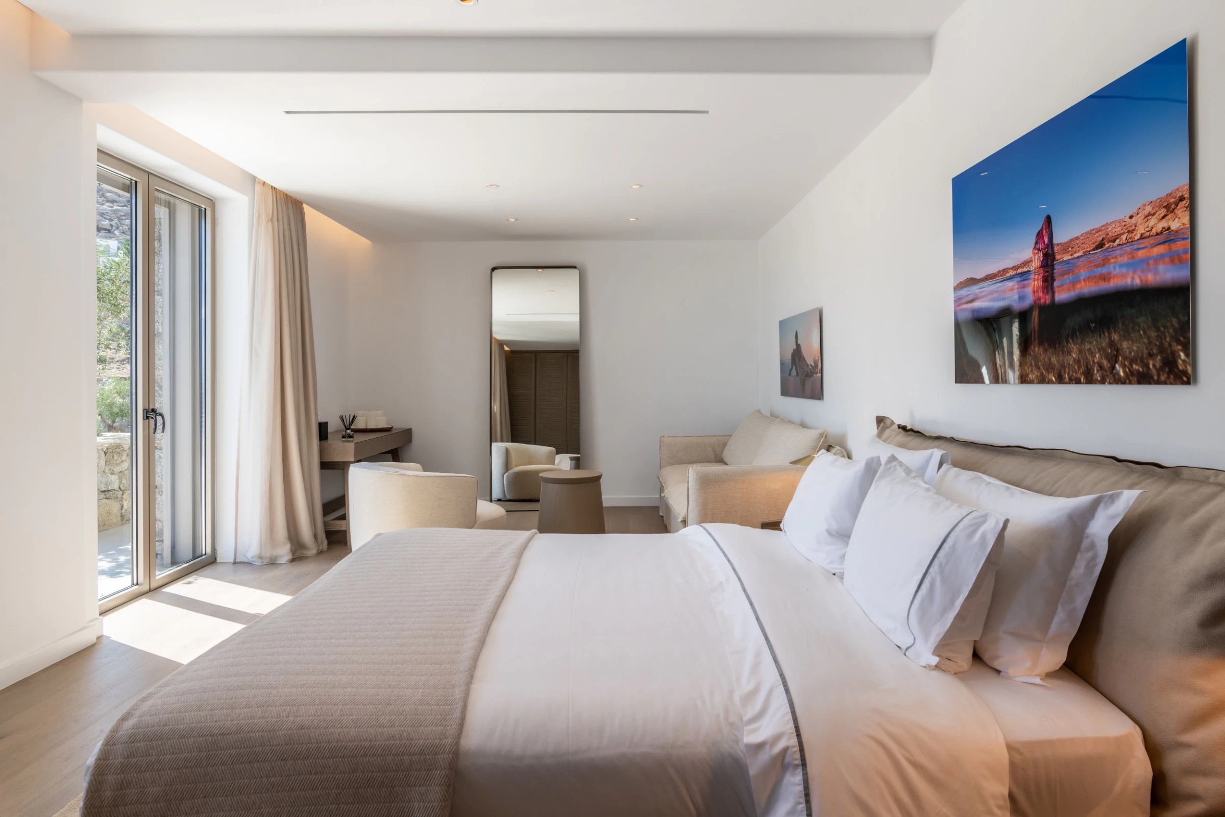 In these dreamlike surroundings, the main villa features 7 large en-suite bedrooms, all garnished with panoramic sea views and some with impressive walk-in closets, as well as a huge open-space living room-dining room- kitchen complex with extensive glass window walls, offering unobstructed views to the stunning Psarou, Platys Gialos and Paraga beaches. On the lower level of the villa fine dining lovers will be happy to discover a professional, restaurant-level, kitchen for the in-house private chefs to work their magic, as well as separate staff quarters for the live-in personnel.